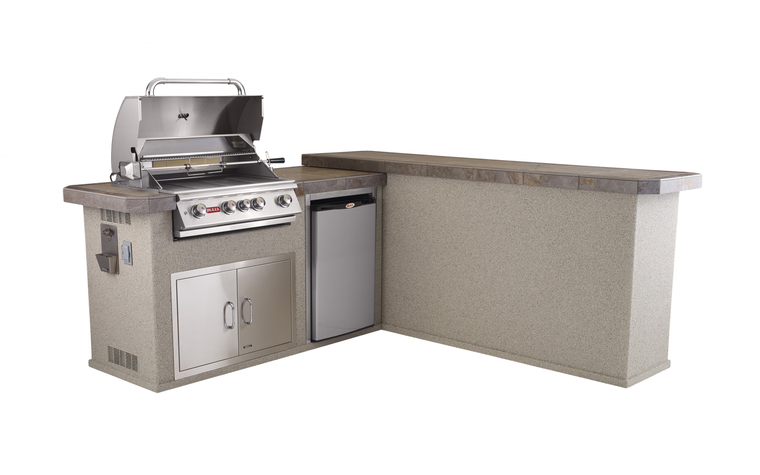 The Mesquite Q Island Kitchen Concept‘s expansive bar area is the best way to impress your guests with an outdoor BBQ. With its spacious seating you can upgrade your patio or backyard from the average outdoor furniture and cook your best grilling recipes in style. Features stainless steel gas grill and refrigerator.